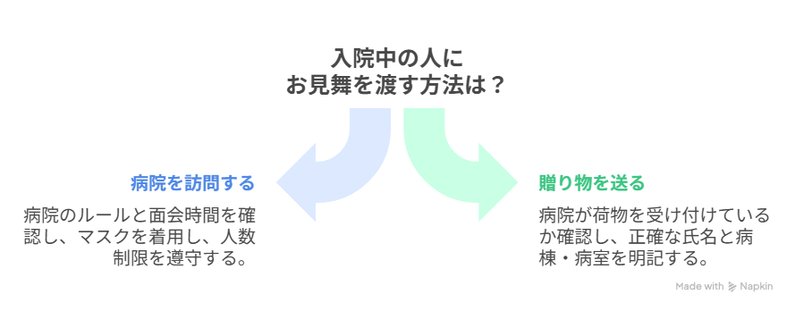 もし面会が難しい場合には、無理に訪問せず宅配で贈り物を届ける方法もあります。その際は必ず「病院宛てで荷物を受け付けているか」を確認し、正確に氏名と病棟・病室を明記することが重要です。