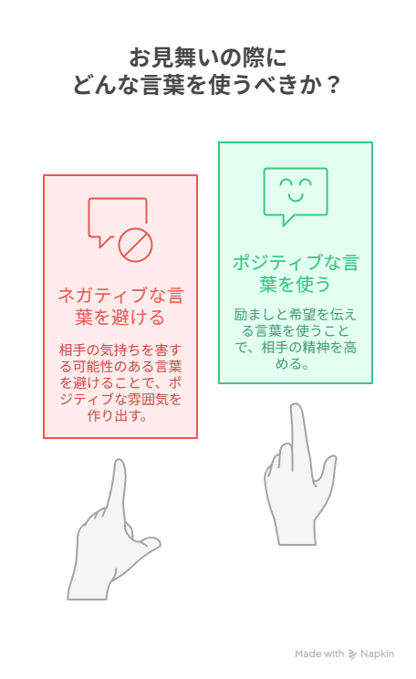 お見舞いでは、何を贈るかだけでなく「どんな言葉を添えるか」も大切です。特に言葉選びは、相手の気持ちを左右するので注意しましょう。