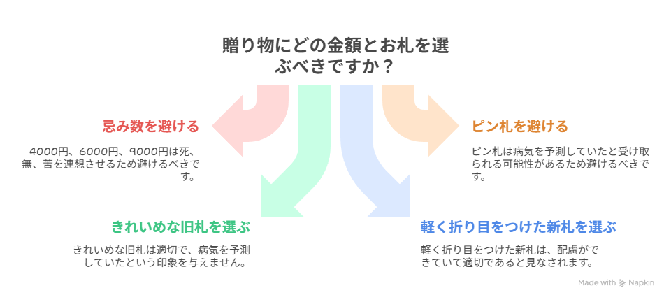 お札はピン札を使うと「前もって用意していた=病気を予測していた」と受け取られることがあるので、きれいめな旧札や軽く折り目をつけた新札を選ぶのが無難です。