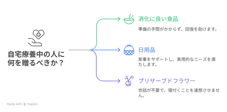 自宅で療養している場合は、体調の回復を助けるものや日常生活をサポートするモノがよさそうです!