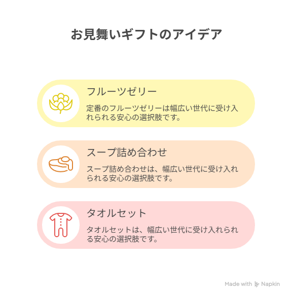 定番のフルーツゼリーやスープ詰め合わせ、タオルセットなどは幅広い世代に受け入れられる安心の選択肢です。