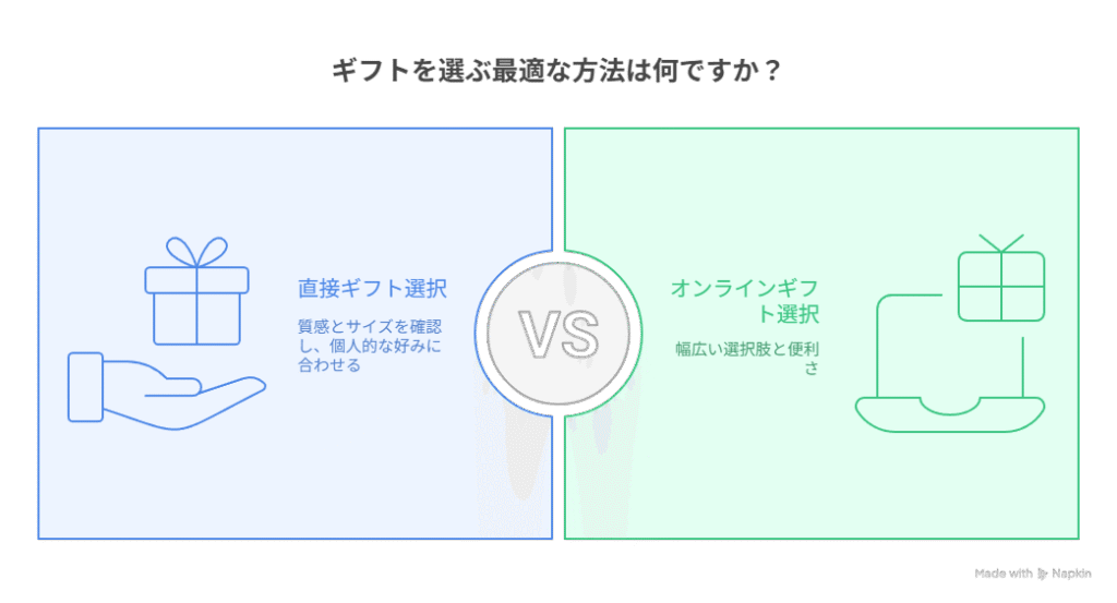 百貨店などの店頭で直接ギフトを選ぶ利点は、商品の実物を見て質感やサイズを確認できること。相手の好みに合わせたい場合や、自分の目で確かめたいときにオススメです。