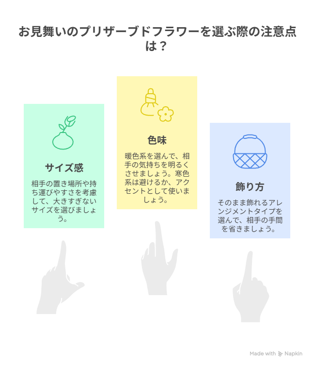 プリザーブドフラワーをお見舞いで検討するとき、 多くの人が迷いやすいポイントは、大きく分けて次の3つです。