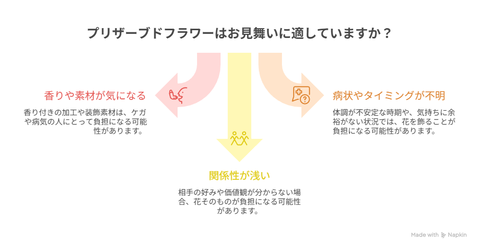 プリザーブドフラワーは条件が合えばお見舞いに向いている一方で、状況によっては別の選択肢を考えたほうが無難な場合もあります。