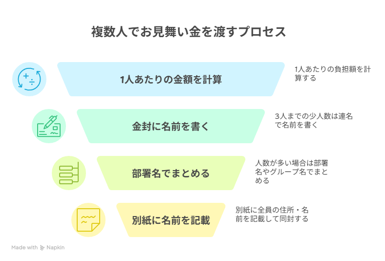 職場などでは、複数人でまとめてお見舞い金を渡すケースもよくあります。この場合でも、個人で渡す場合と基本的な相場やマナーは変わりません。